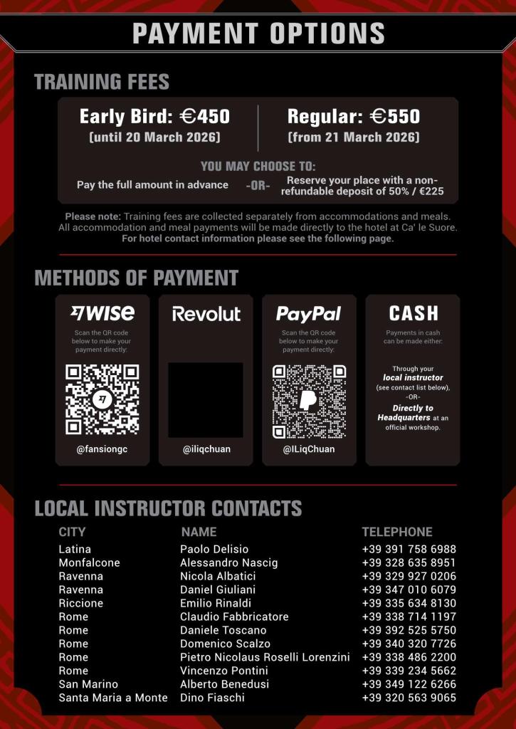 [Cagli, Italy] 5 Days Retreat with GM Sam F.S. Chin When 20/May/26 - 24/May/26 12:00 am Add To Calendar Download ICS Google Calendar iCalendar Office 365 Outlook Live Event Type GM Sam Chin Hsin Chin Share this: Share on X (Opens in new window) X Share on Facebook (Opens in new window) Facebook More Share on LinkedIn (Opens in new window) LinkedIn Share on Reddit (Opens in new window) Reddit Share on Tumblr (Opens in new window) Tumblr Share on Pinterest (Opens in new window) Pinterest Share on WhatsApp (Opens in new window) WhatsApp Email a link to a friend (Opens in new window) Email Post navigationPrevious post: [Jesi, Italy] Footwork: Balance & Power with Instructor Joshua CraigNext post: [Portland, USA] Master Hsin Portland Seminar Series