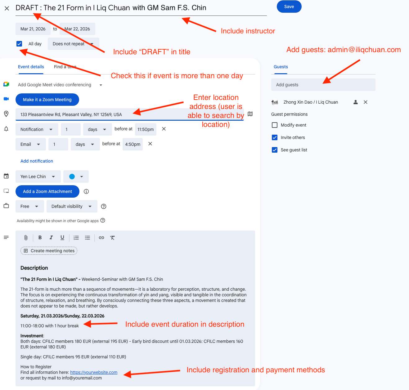 2. Then send admin@iliqchuan.com an email with the URL/link to the calendar entry - with subject WORKSHOP TO POST