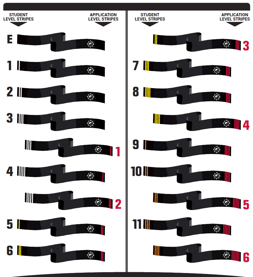 A visual diagram showcasing the progression of sashes for the 12 Student Levels and 6 Application Levels of I Liq Chuan / Zhong Xin Dao.
