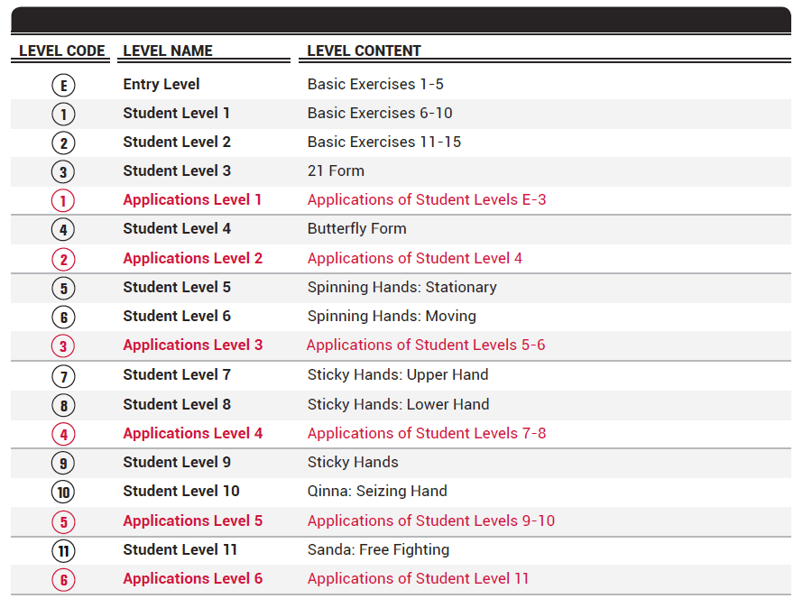 The chart visually demonstrates the progressive nature of the curriculum, from foundational awareness to more refined internal mechanics that require a heightened awareness of the body and mind.